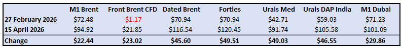 An increasing number of media outlets and news agencies are of the view that oil futures markets are now detached from reality. This assumption is based on the data summarised in the table below, which shows the changes in both physical oil and futures between February 27, the day before the US/Israeli war against Iran began and April 15.
