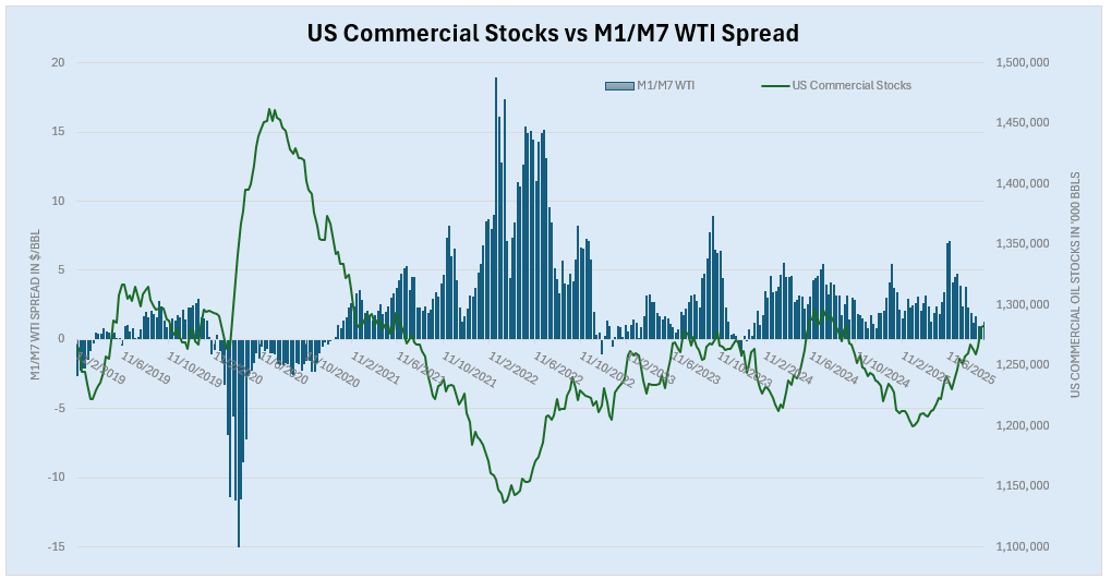 Geopolitical support will eventually fade, leaving the fundamental backdrop as the sole driving force. While this outlook appears tilted more to the downside, it is useful to support such an assessment with the two most reliable indicators of oil balance: spreads and stocks.